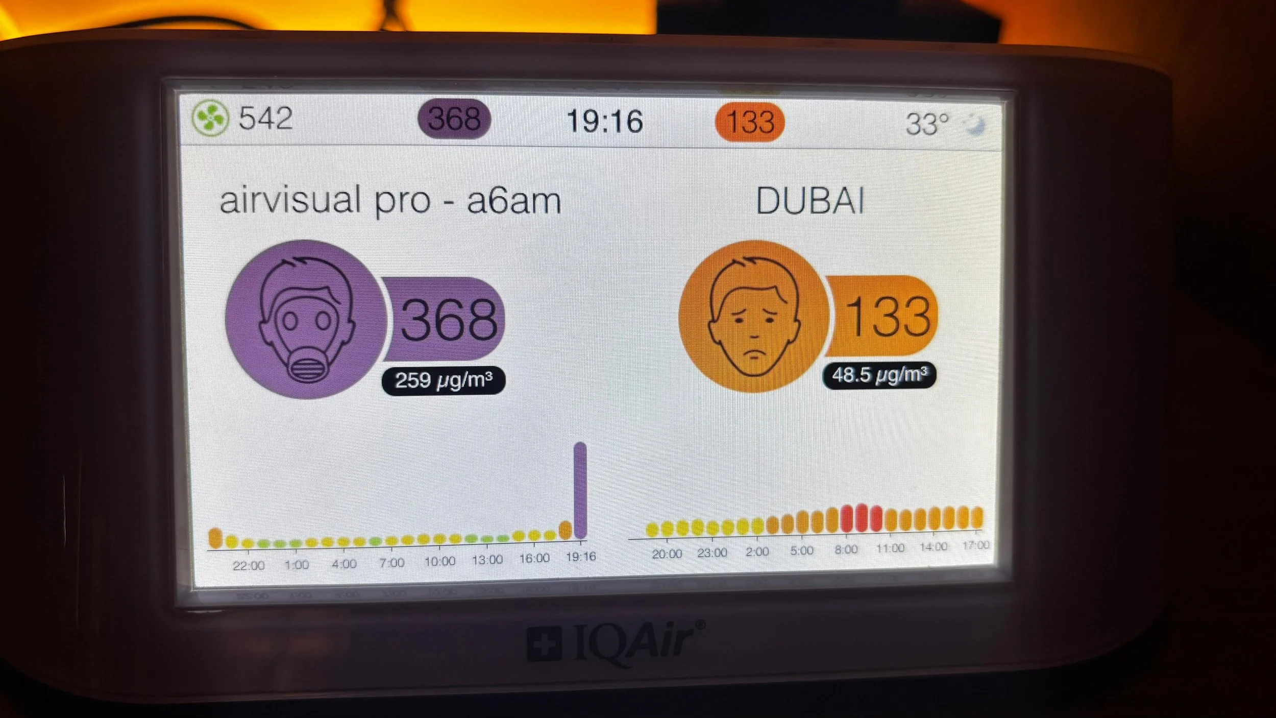 Right side (orange): Outdoor air quality in Dubai at the same time. The reading of 133 AQI and 48.5 µg/m³ is already unhealthy for sensitive groups, but still far better than what was inside.